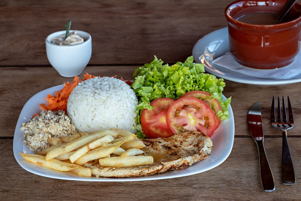 Arroz soltinho acompanhado de um feijão de sabor sem igual. Acompanha salada bem fresquinha, farofa e batata frita.